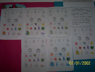Inainte de inceperea evaluarii se lucreaza la panoul mare cu toti copiii, cateva exercitii de comparare a multimilor, formandu-se multimi cu tot atatea, mai multe si mai putine elemente. In timp ce se strangeau diverse multimi, acestea erau puse in cosulet, sau langa, in fata, sub cosulet, recapitulandu-se astfel si pozitiile spatiale. Se trece apoi la rezolvarea fisei de evaluare.
